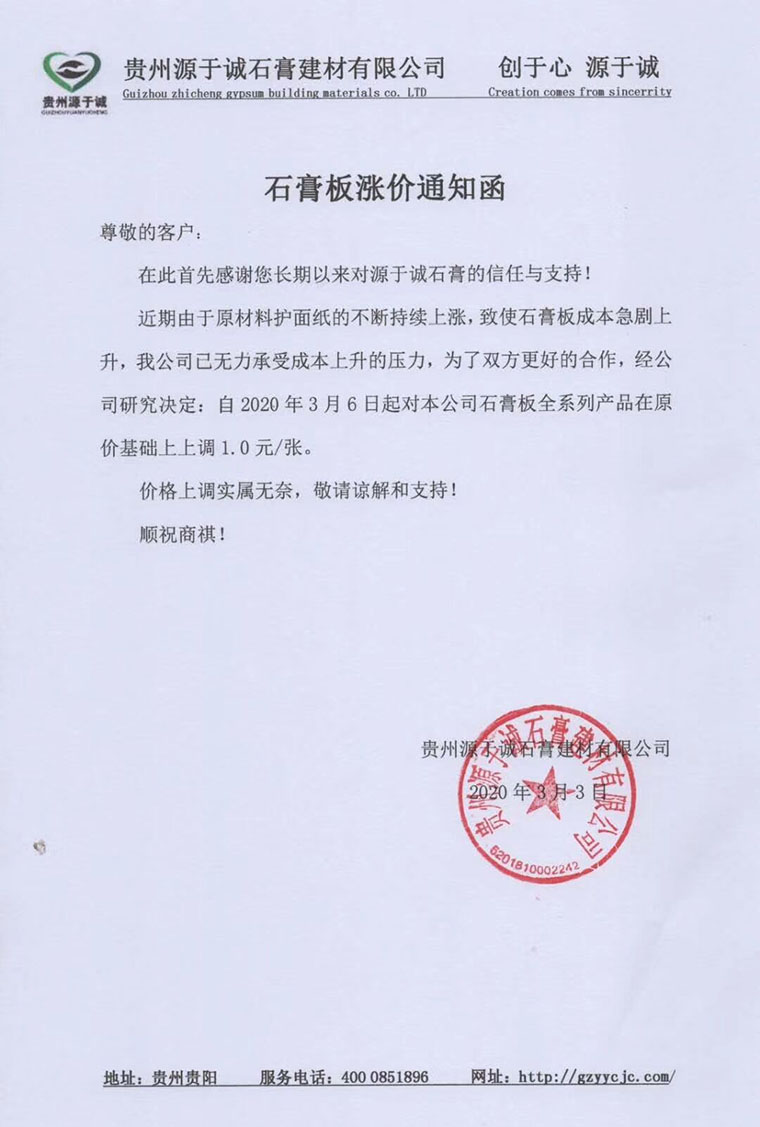石膏板漲價通知函